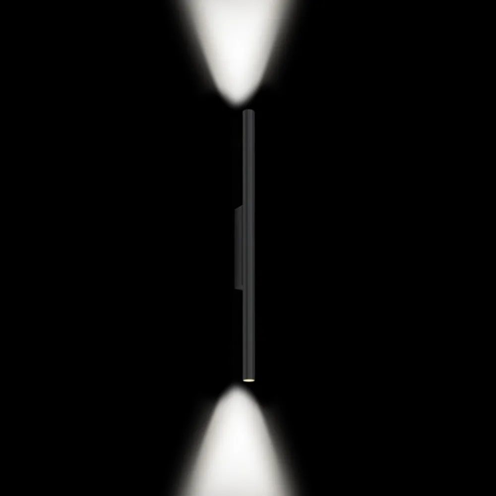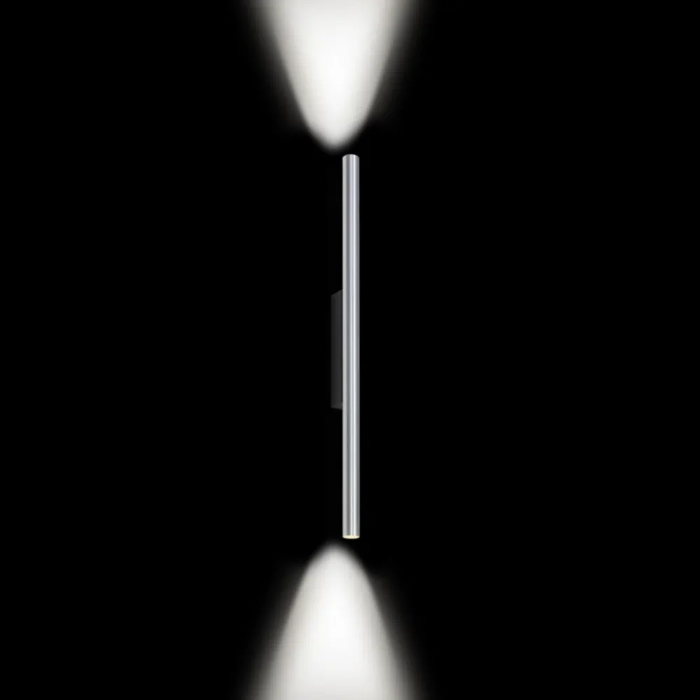 Ce luminaire mural tubulaire mat diffuse une lumière chaude (2700K) vers le haut et le bas. Grâce à la technologie COB et un IRC ≥ 90, il offre un éclairage précis (23°) avec un faible éblouissement (UGR ≤ 10).
