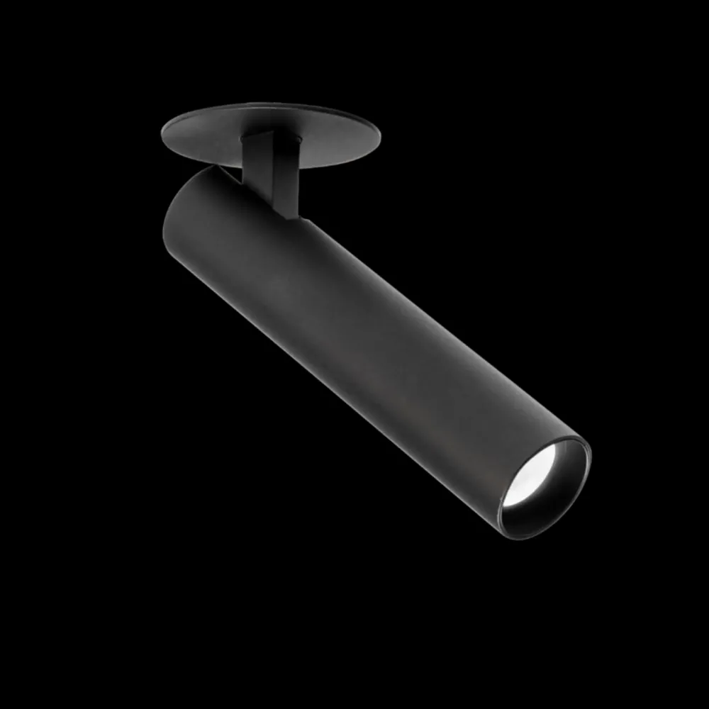 Spot demi-encastré en aluminium mat, technologie COB, tête rotative à 350° et orientable à 90°. Montage sans outil, profondeur d’encastrement 60 mm. IP20, Classe 3, driver non inclus, source remplaçable par un professionnel.