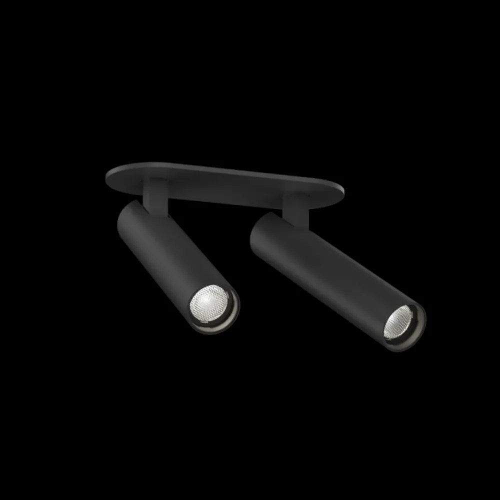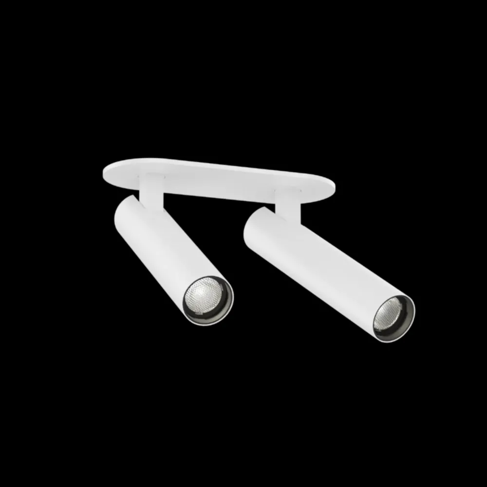 Plafonnier encastré avec 2 spots en aluminium mat, technologie COB, lumière 2700 K, CRI ≥ 90, angle 30°. Spots rotatifs à 350° et orientables à 90°. Installation sans outil, profondeur d’encastrement 60 mm. IP20, Classe 3, driver non inclus, source remplaçable par un professionnel.