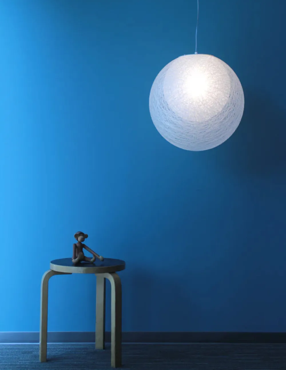 Cette suspension est fabriquée en entourant un moule avec de la fibre de verre, comme un cocon. La douceur de la lumière rappelle les lanternes japonaises. La simplicité de sa forme et son volume raisonnable lui permet de convenir à toutes les pièces.