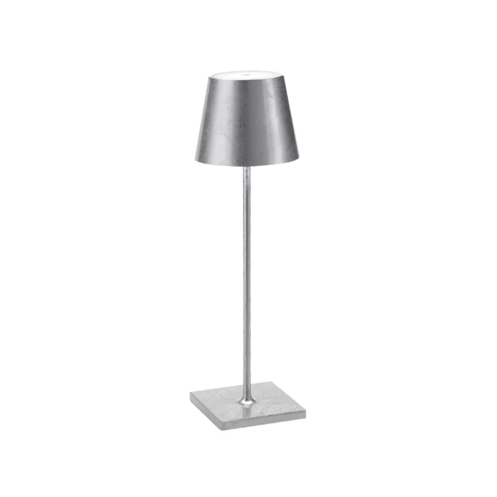 Poldina proLampe de table rechargeable, corps en aluminium peint, diffuseur en polycarbonate et source lumineuse à LED. La lampe est allumée et éteinte par un bouton tactile situé sur le dessus du diffuseur, avec le même bouton, il est possible de diminuer l’intensité du flux lumineux et de régler la température de couleur de la lumière, en choisissant entre 2700 et 3000K. La lampe dispose également d’une fonction de mémoire de gradateur (lorsque la lampe est allumée, l’intensité lumineuse correspondra à celle précédemment réglée) et d’un degré de protection IP65 qui la rend adaptée à une utilisation intérieure et extérieure. L’autonomie de la batterie est garantie 12 heures.