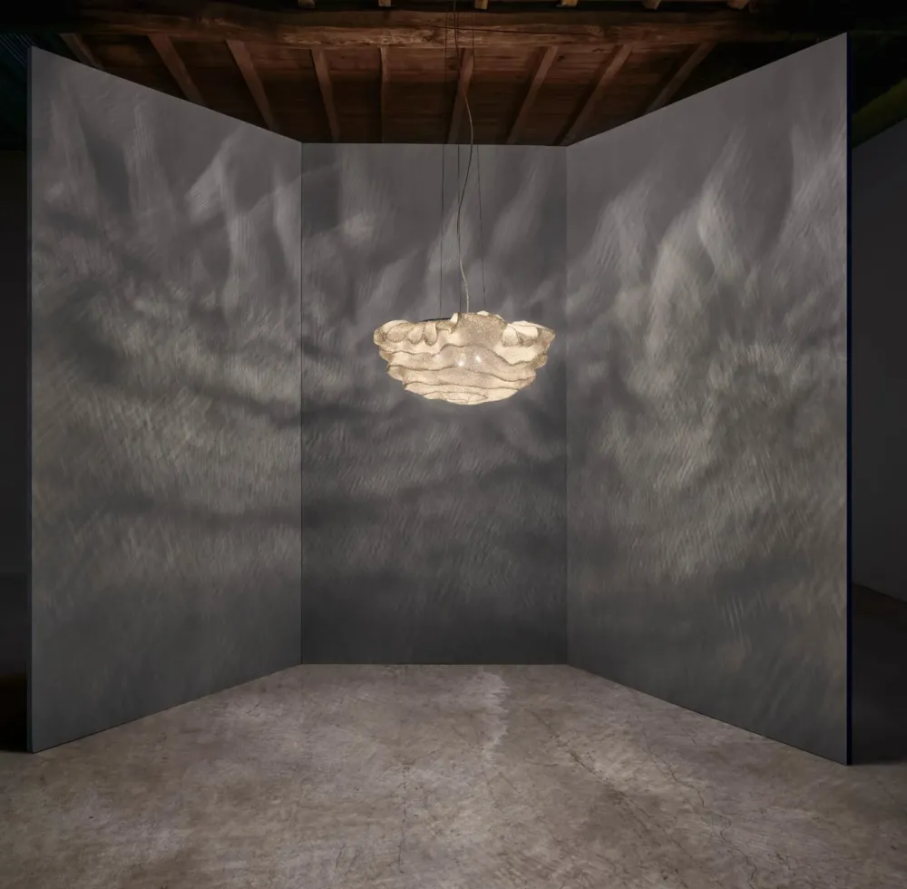 Un nuage ou une fleur? Laissez parler votre imagination. « Une forme dynamique qui semble être en constante évolution. Un nuage de courbes suggestives, des volumes impossibles qui entrelacent le futur et le présent d’une manière subtile. Une forme décomplexée faite de matériaux de pointe. » Fabriquée en acier inoxydable peint, la suspension Nevo diffuse une lumière douce et tamisée, très agréable pour une chambre, une entrée ou un couloir. Quelques ouvertures sur le dessus permettent une diffusion de la lumière en indirect. Existe en blanc, beige, gris ou taupe : nous consulter.