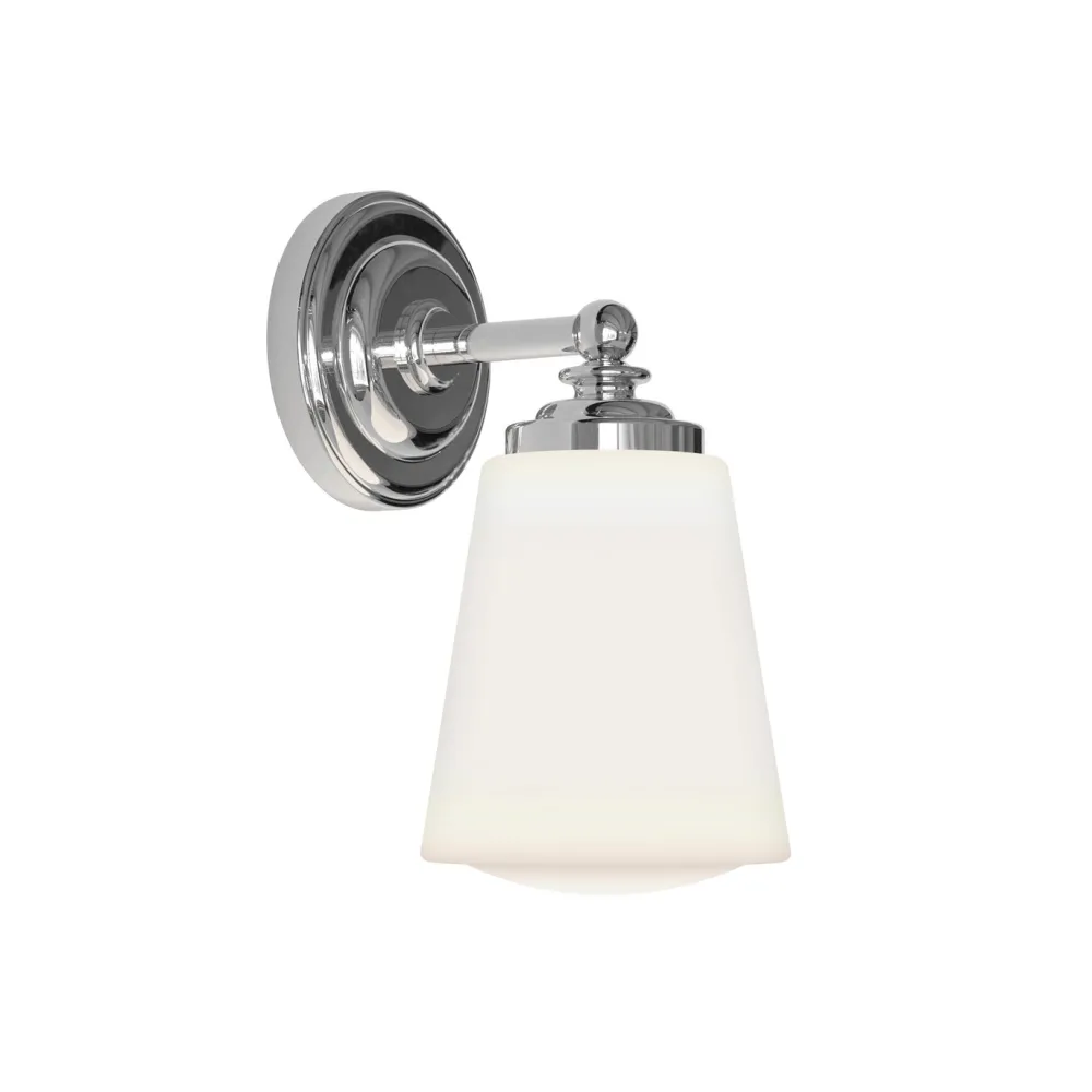 Applique murale pour salle de bain. Finition chrome poli, diffuseur en verre blanc opalin.