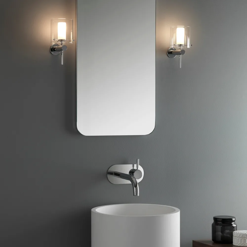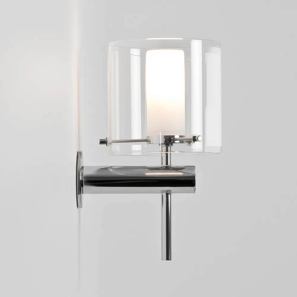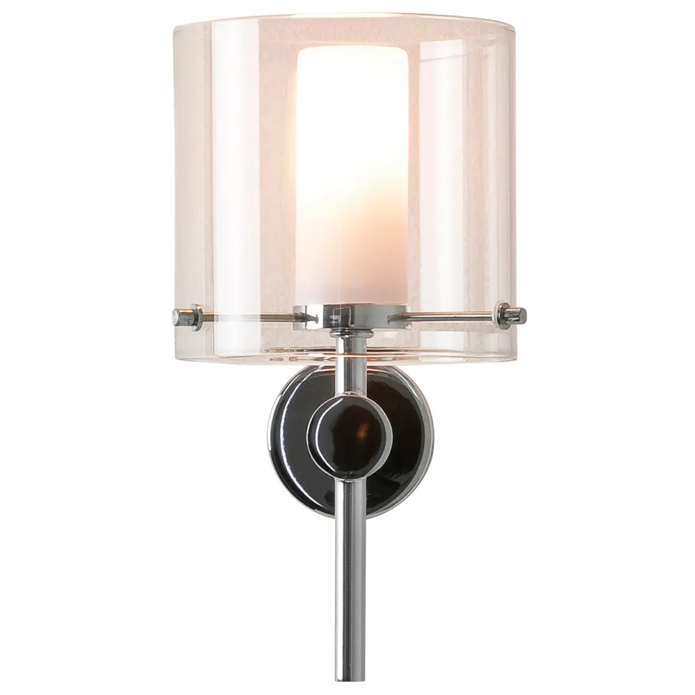 Applique murale pour salle de bain. Finition chrome poli, diffuseur en verre blanc opalin/abat-jour en verre transparent.