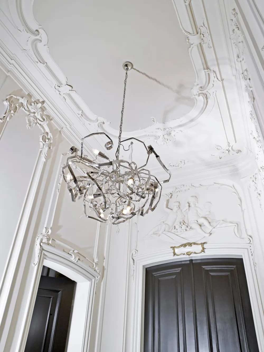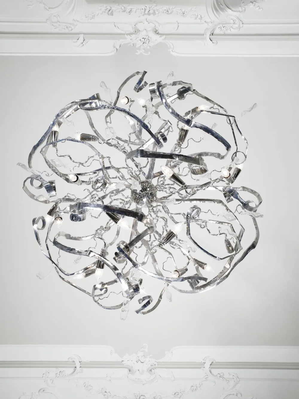 La collection Delphinium évolue entre le luminaire et la sculpture. Le travail de la matière y est remarquable et la suspension se fait d’emblée remarquée par son orignalité et sa présence unique. Chauffé par le feu, l’acier a été travaillé pour obtenir des proportions parfaites. La masculinité de l’acier contraste avec les formes de la collection, féminines et généreuses.