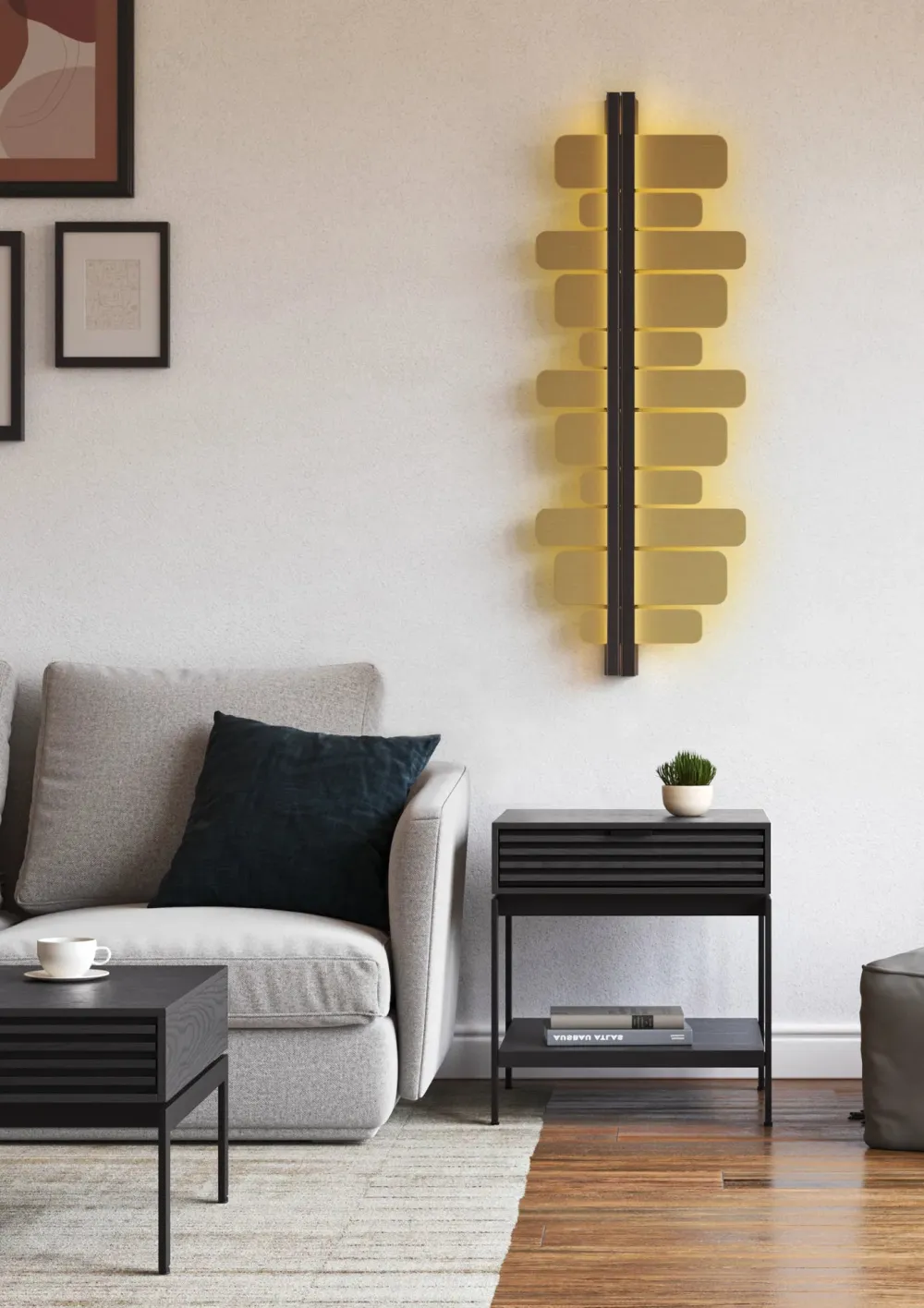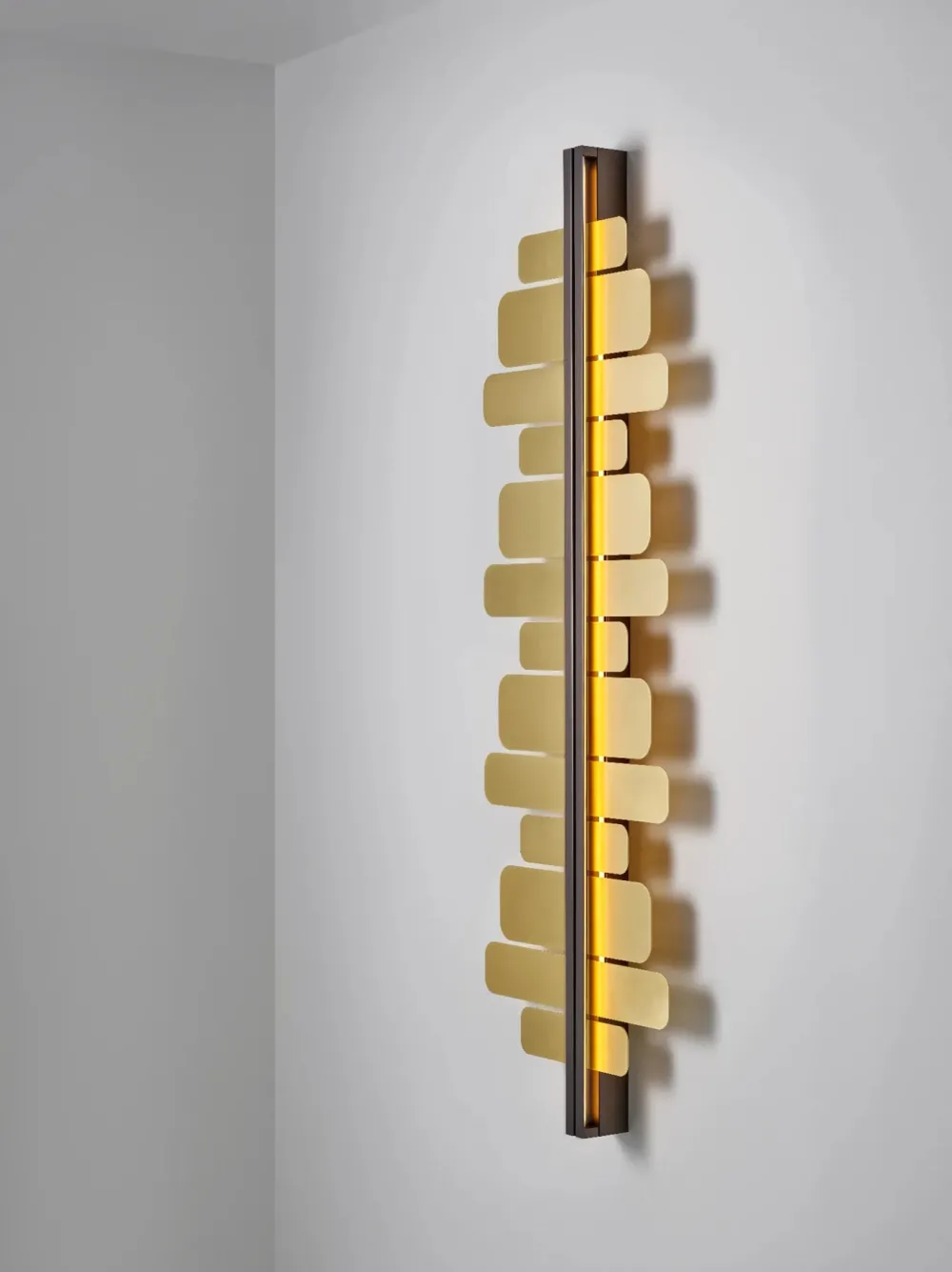 Laissez-vous charmer par les courbes harmonieuses de ce modèle d’applique Score, une véritable sculpture lumineuse de laiton massif avec éclairage LED intégré qui habille votre intérieur et devient une pièce centrale de décoration. Le modèle Score est composé d’une pièce verticale rectangulaire allongée en laiton massif avec diffuseur en polycarbonate intégré, dans laquelle sont glissé les palettes en fine plaque rectangulaires aux angles arrondi positionnées de manière asymétrique. Celles-ci jouent le rôle de réflecteur et teintent d’or et donne une délicieuse chaleur à la lumière, pour un modèle qui se place tant à l’horizontale qu’à la verticale.