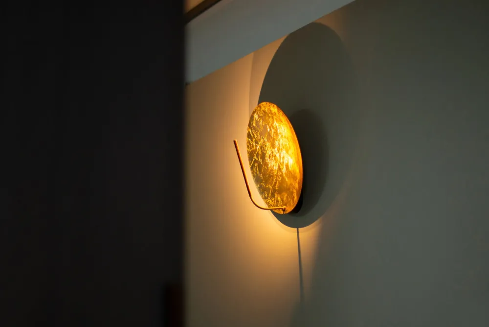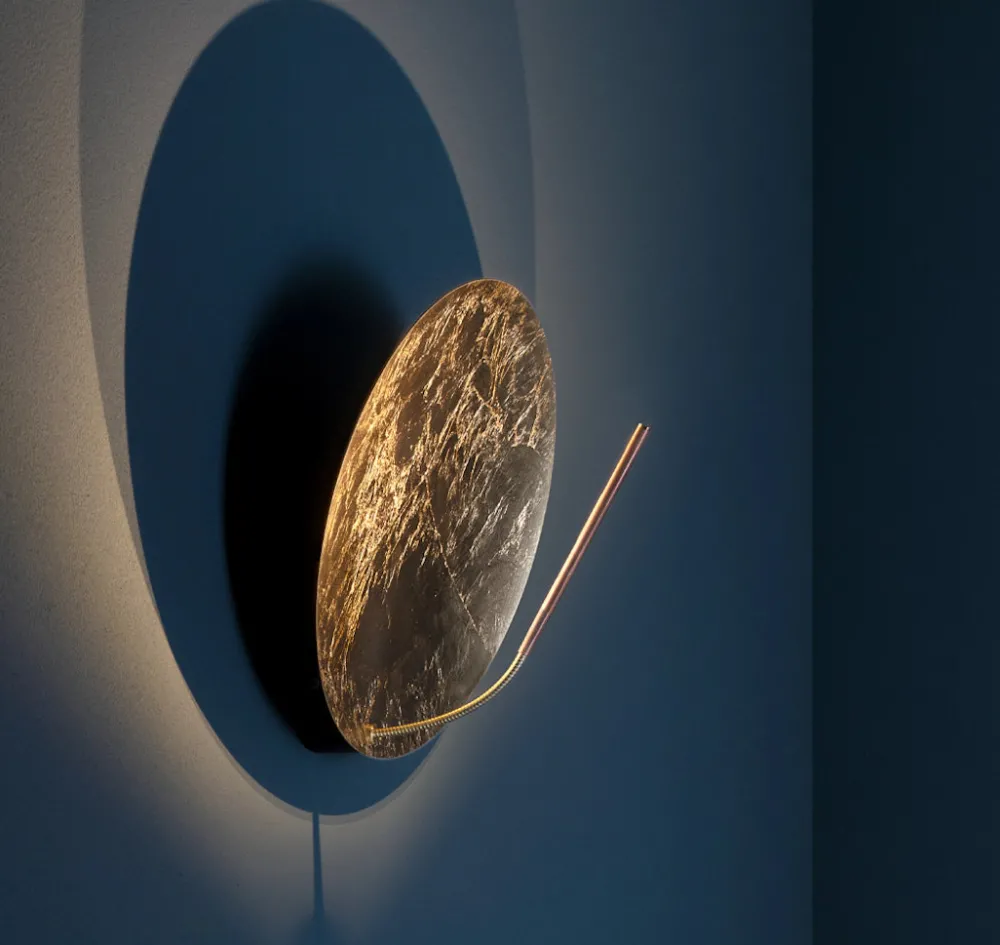 Luci d’Oro naît comme une réflexion sur la couleur de la lumière : la lumière dorée du soleil, du feu ; des lumières chaudes, où le concept de réfraction commence à prendre forme dans l’esprit d’Enzo Catellani, qui l’appliquera souvent à d’autres créations.