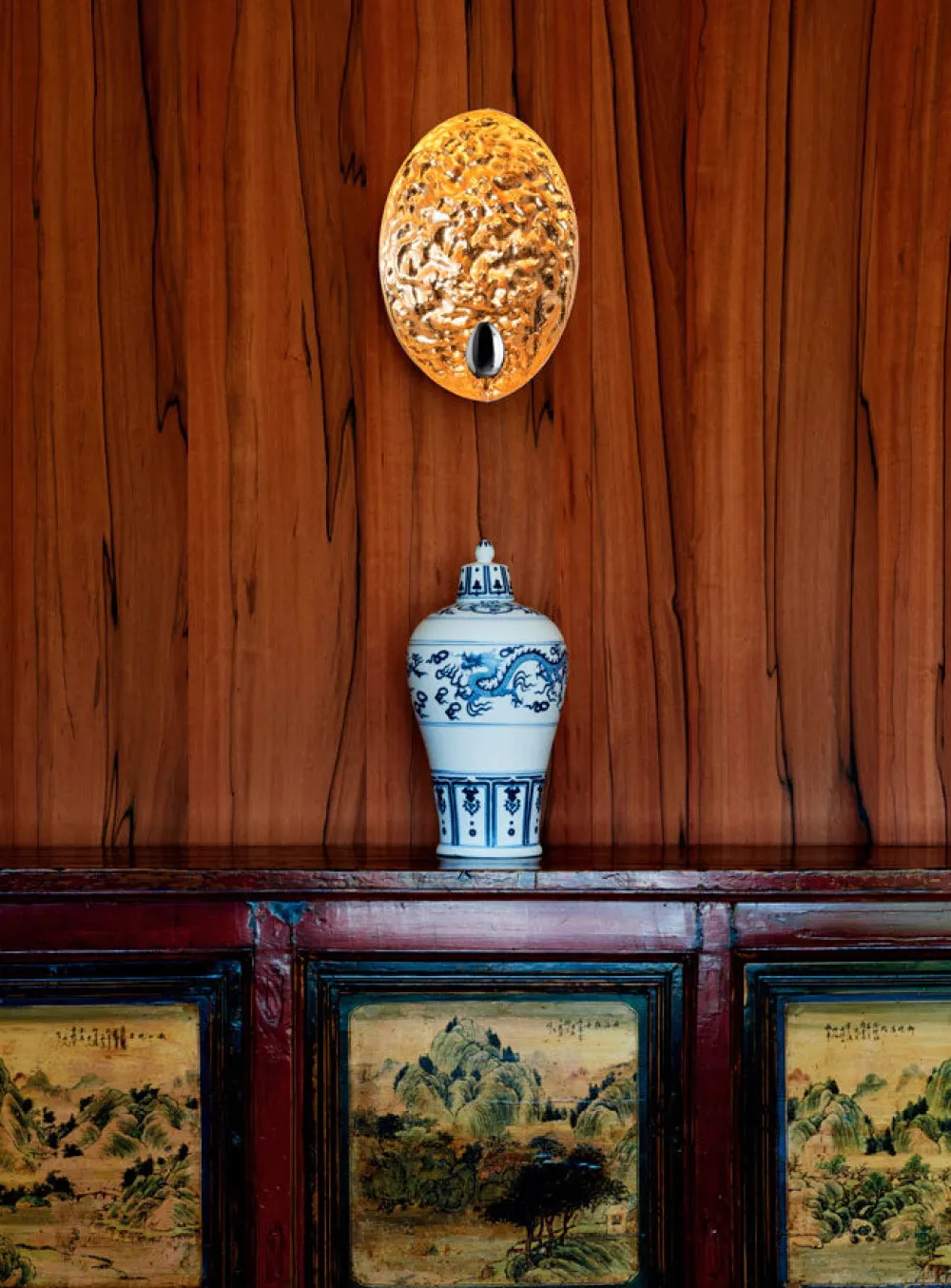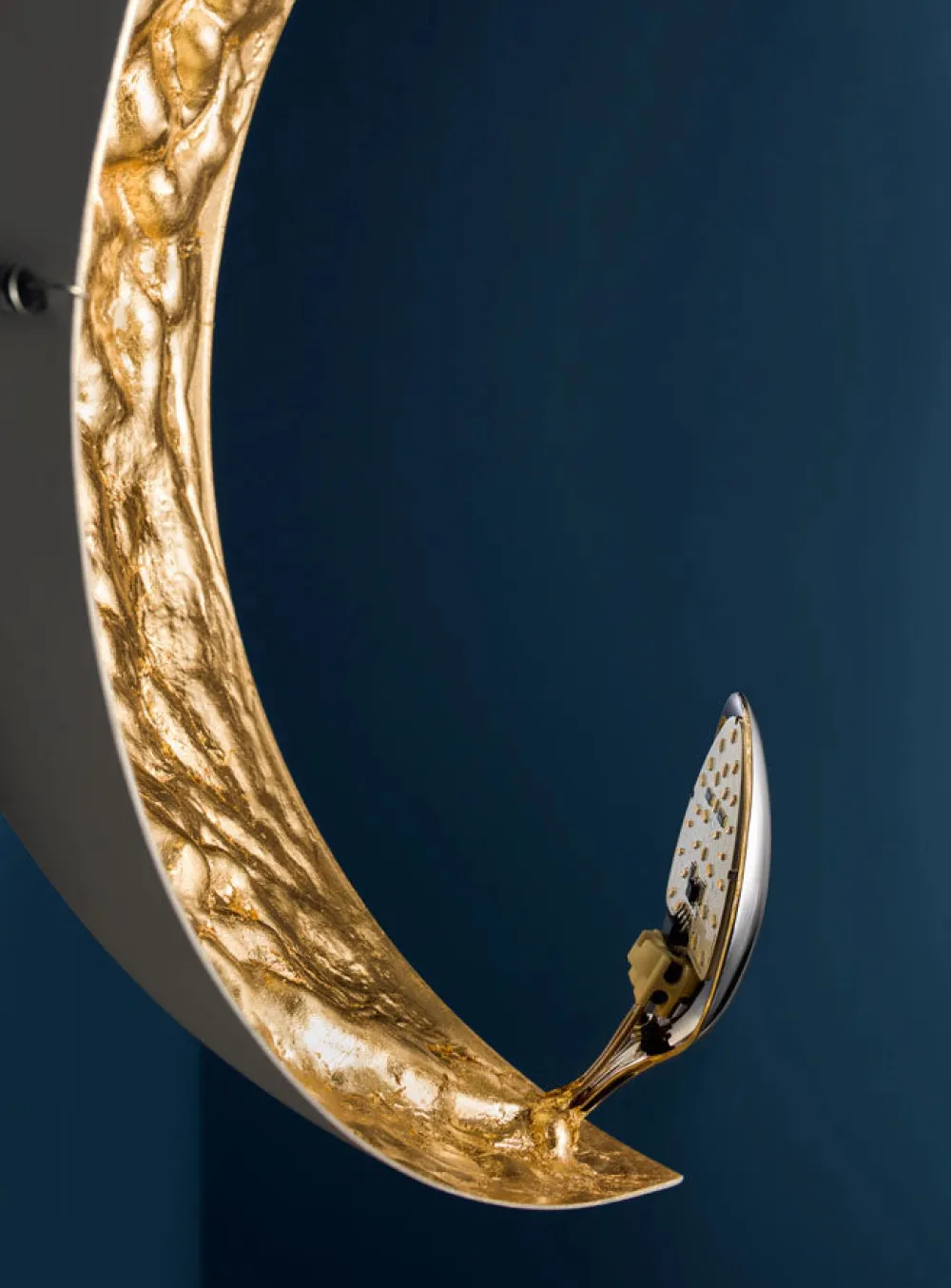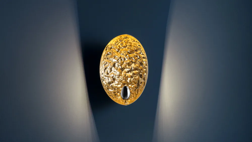 Avec ses creux et renflements inspirés de la surface de la Lune, cette lampe s’offre un design poétique dont le rayonnement ne passe pas inaperçu. Stchu-Moon sépare la source lumineuse de l’objet éclairant, qui acquiert ainsi une valeur esthétique indépendante. La réfraction de la lumière se confronte ici à des surfaces délibérément irrégulières, qui multiplient la quantité de lumière et rendent l’objet lui-même entièrement lumineux. Outre son cachet original, l’applique murale Stchu-Moon 05 se compose d’un corps en aluminium dont la surface irrégulière est recouverte de feuilles métalliques. La lumière émise depuis le réflecteur en acier est directement projetée sur le diffuseur d’où elle est réfléchie dans la pièce. Avec son apparence expressive et son éclairage doux, l’applique murale Stchu-Moon 05 meuble l’entrée, le couloir ou la chambre de sa forte valeur décorative. Sa fabrication manuelle fait que chaque pièce présente de légères variations de formes qui rehaussent son authenticité et lui confèrent une saveur artisanale.