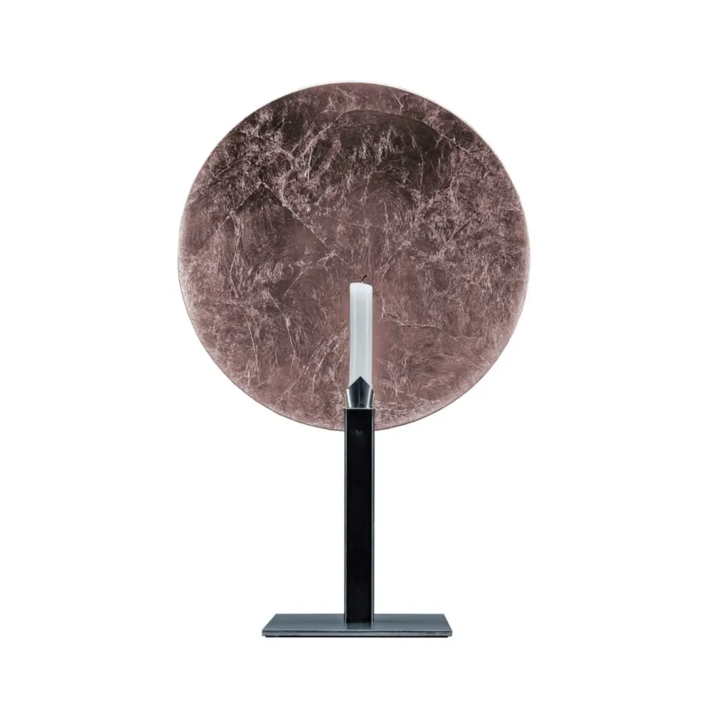 Bougeoir de la collection Luci d’Oro, qui met en avant la matière délicatement travaillée à la main du disque éclairé par la bougie.