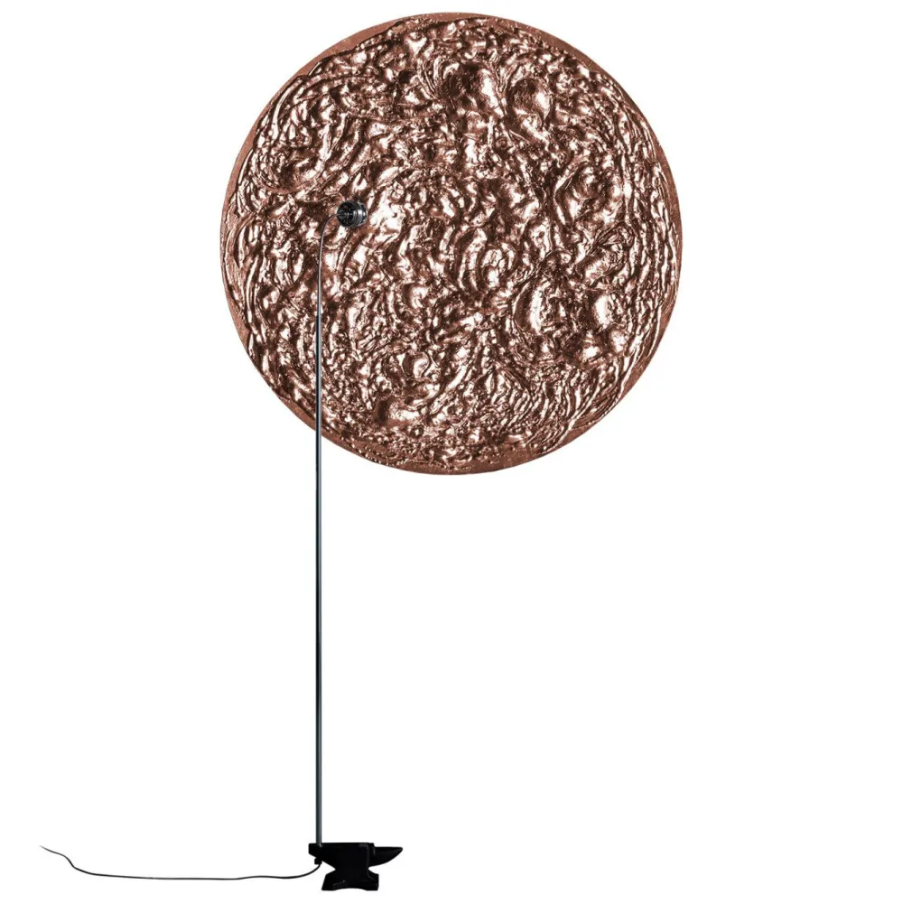 Stchu-Moon sépare la source lumineuse de l’objet éclairant, qui acquiert ainsi une valeur esthétique indépendante. La réfraction de la lumière se confronte ici à des surfaces délibérément irrégulières, qui multiplient la quantité de lumière et rendent l’objet lui-même entièrement lumineux. La lampe de sol Stchu-Moon 08 de Catellani & Smith se compose de deux éléments séparés: le réflecteur est un disque rond en aluminium, fixé au mur. Sa surface présente un relief et est revêtue d’or, d’argent ou de cuivre à la feuille. La lampe de sol est placée devant. Elle est en métal et d’allure sobre et discrète. C’est une simple tige métallique avec une tête de réflecteur. Le socle est une petite enclume de fer. La tête de réflecteur éclaire le disque métallique au mur, de sorte que la lumière est multipliée magiquement par une structure de surface irrégulière et reflétée.