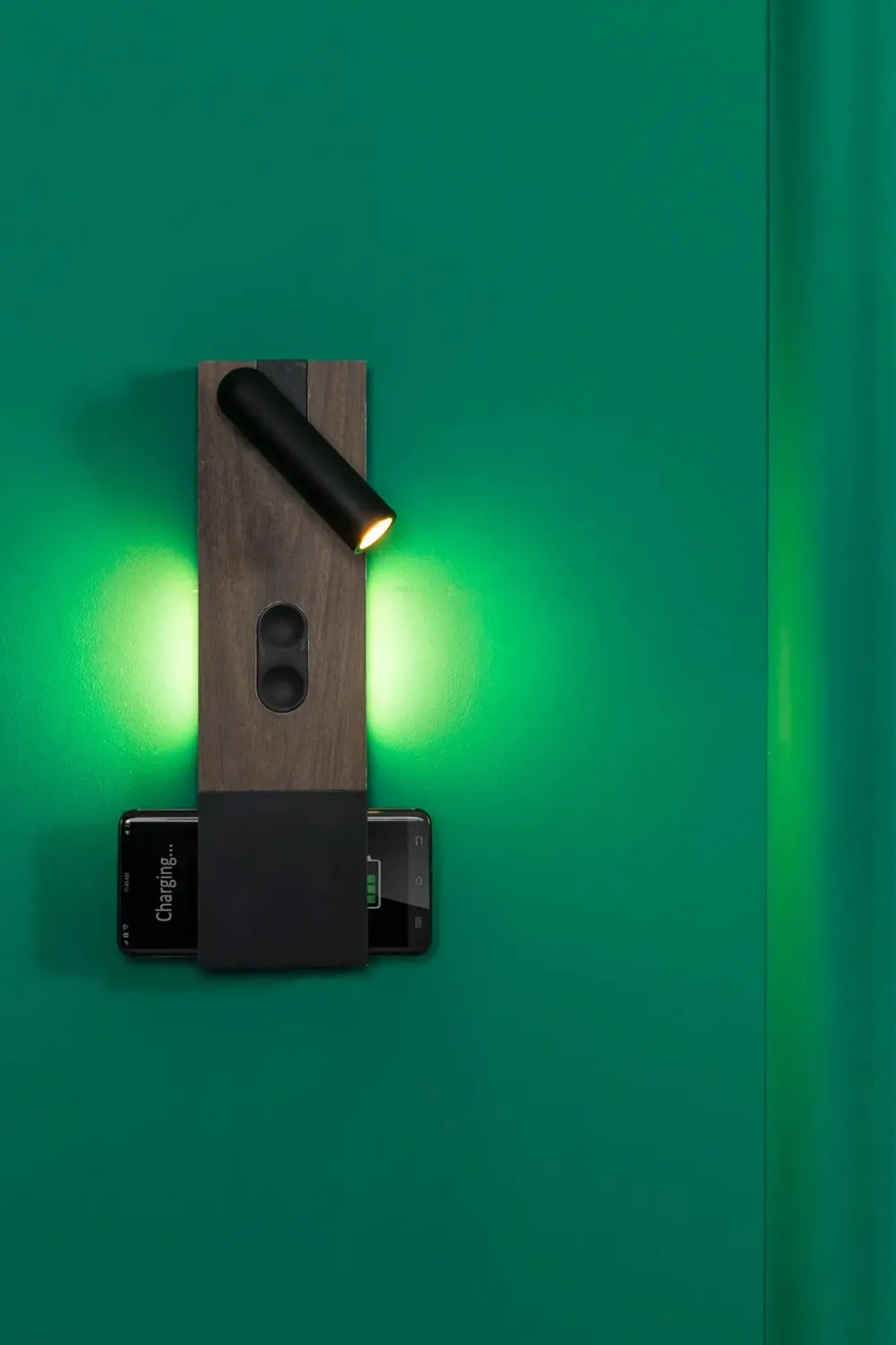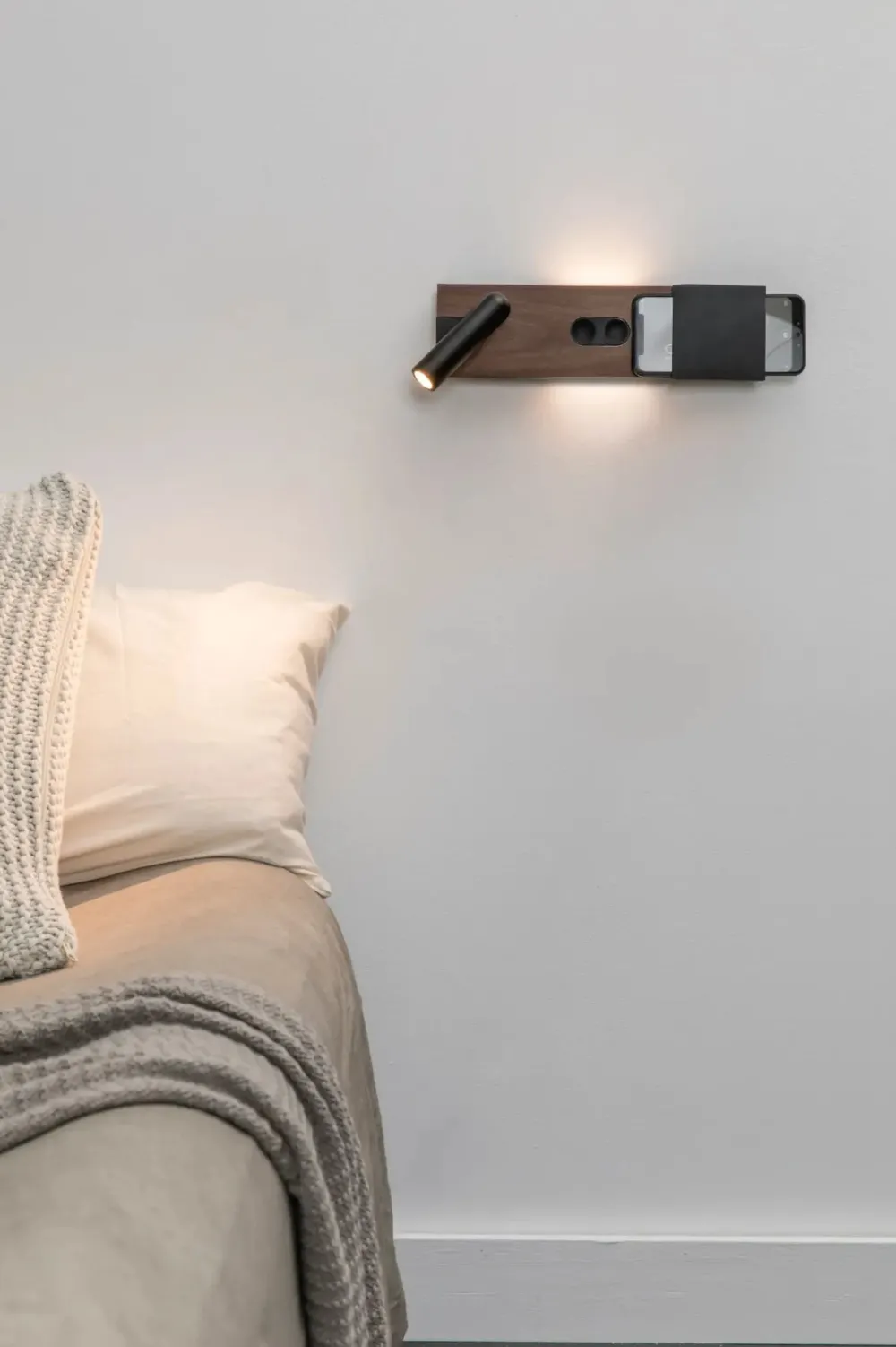 MAGOS est une applique murale en bois d’érable dessinée par Faro Lab, pensée pour les chambres à coucher modernes. Ce luminaire combine deux sources lumineuses : une lumière indirecte projetée derrière la structure, idéale pour une ambiance douce, et une liseuse pivotante pour la lecture. Grâce à son design astucieux, MAGOS offre également un espace pour poser un téléphone, avec une fonction de recharge sans fil intégrée.