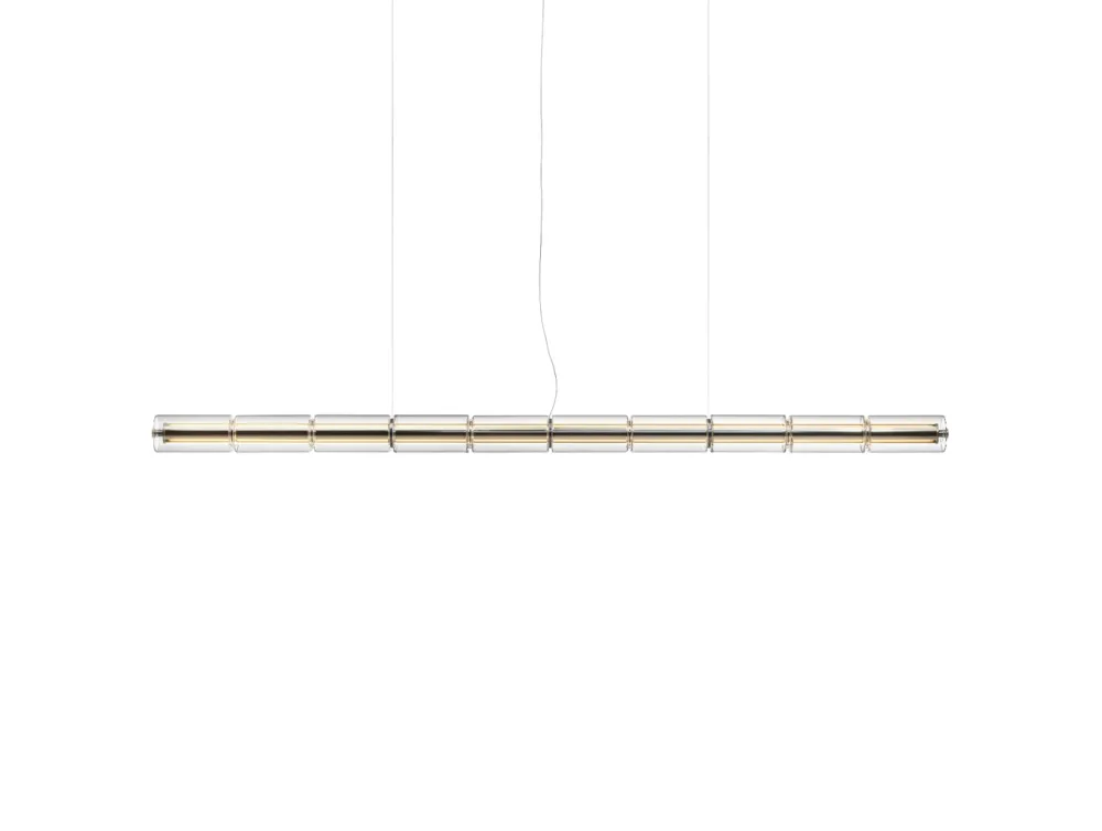 Son tube en aluminium extrudé poli abrite deux bandes LED bidirectionnelles (haut/bas), activables et dimmables indépendamment grâce à un variateur tactile discret. Chaque cylindre, léger et transparent, semble flotter dans l’espace, évoquant un collier lumineux suspendu.