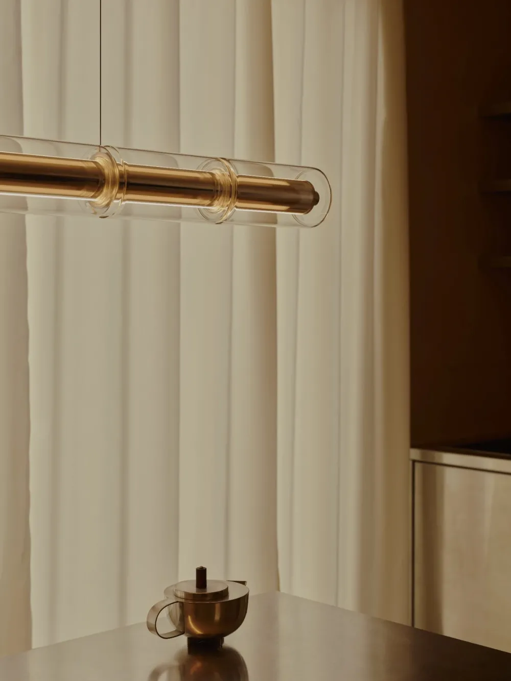 Luce Sferica S2 Cylindrique est idéale pour sublimer de grandes tables ou des espaces professionnels contemporains, en apportant une lumière à la fois fonctionnelle et sculpturale.