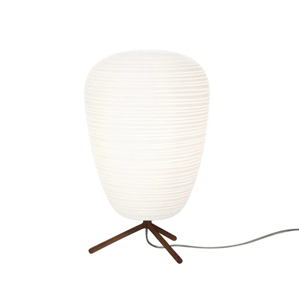Lampes de table à lumière diffuse. Collection de trois formes de diffuseur en verre soufflé à la bouche, selon une méthode de soufflage sans centrifugeage dans le moule («à l’arrêt»). L’effet rayé est obtenu à l’aide d’un moule négatif présentant les décorations qui sont reproduites à la surface du verre. Le verre est ensuite dépoli manuellement à l’aide d’une «bande» et traité à l’acide afin de créer l’effet gypseux. Le diffuseur repose sur un trépied moulé sous pression en alliage de zinc laqué époxy, avec effet rugueux sur la surface métallique.