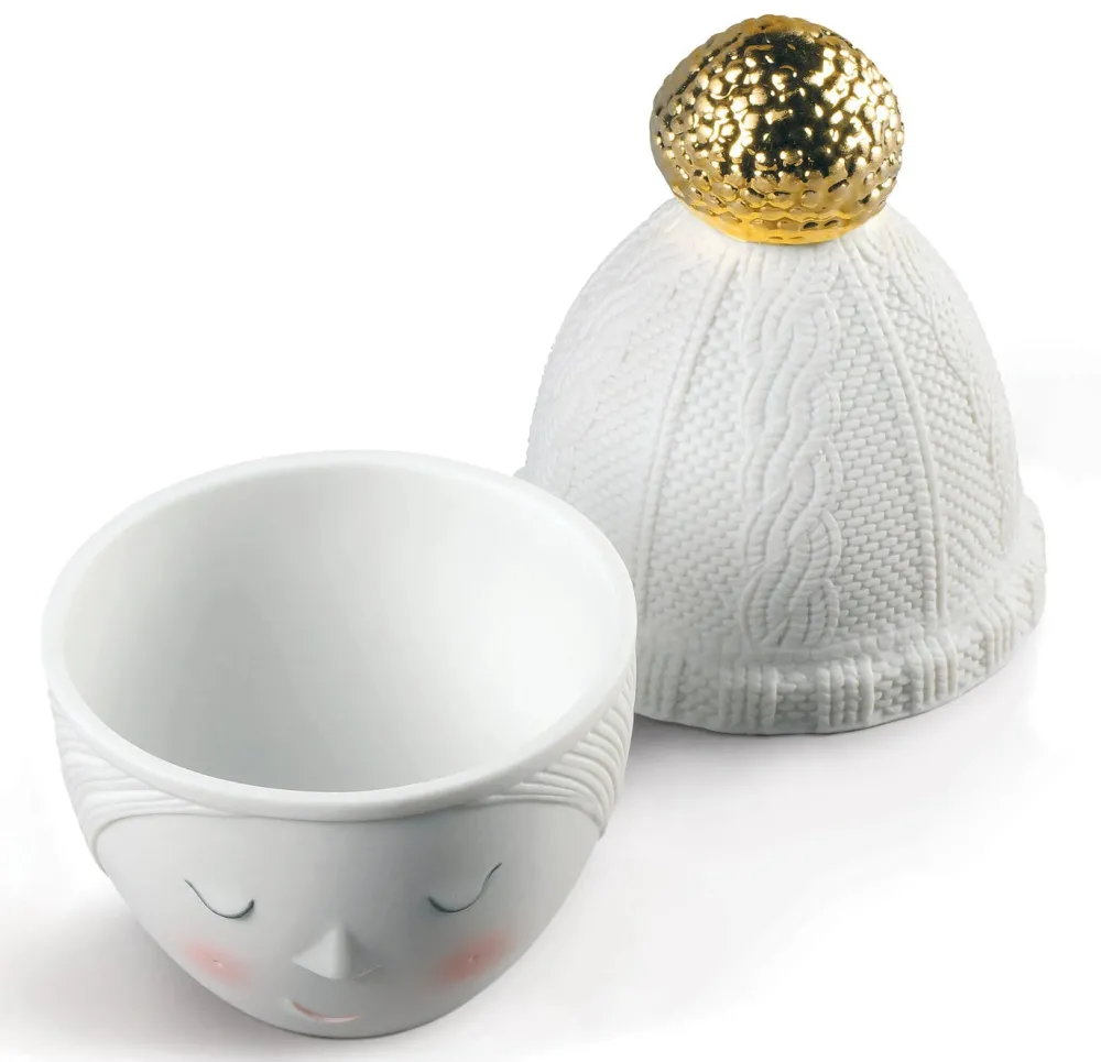 Boîte en porcelaine mate à l’extérieur et brillante à l’intérieur, décorée d’un lustre doré sur le dessus du capuchon et de touches de couleur sur le visage.