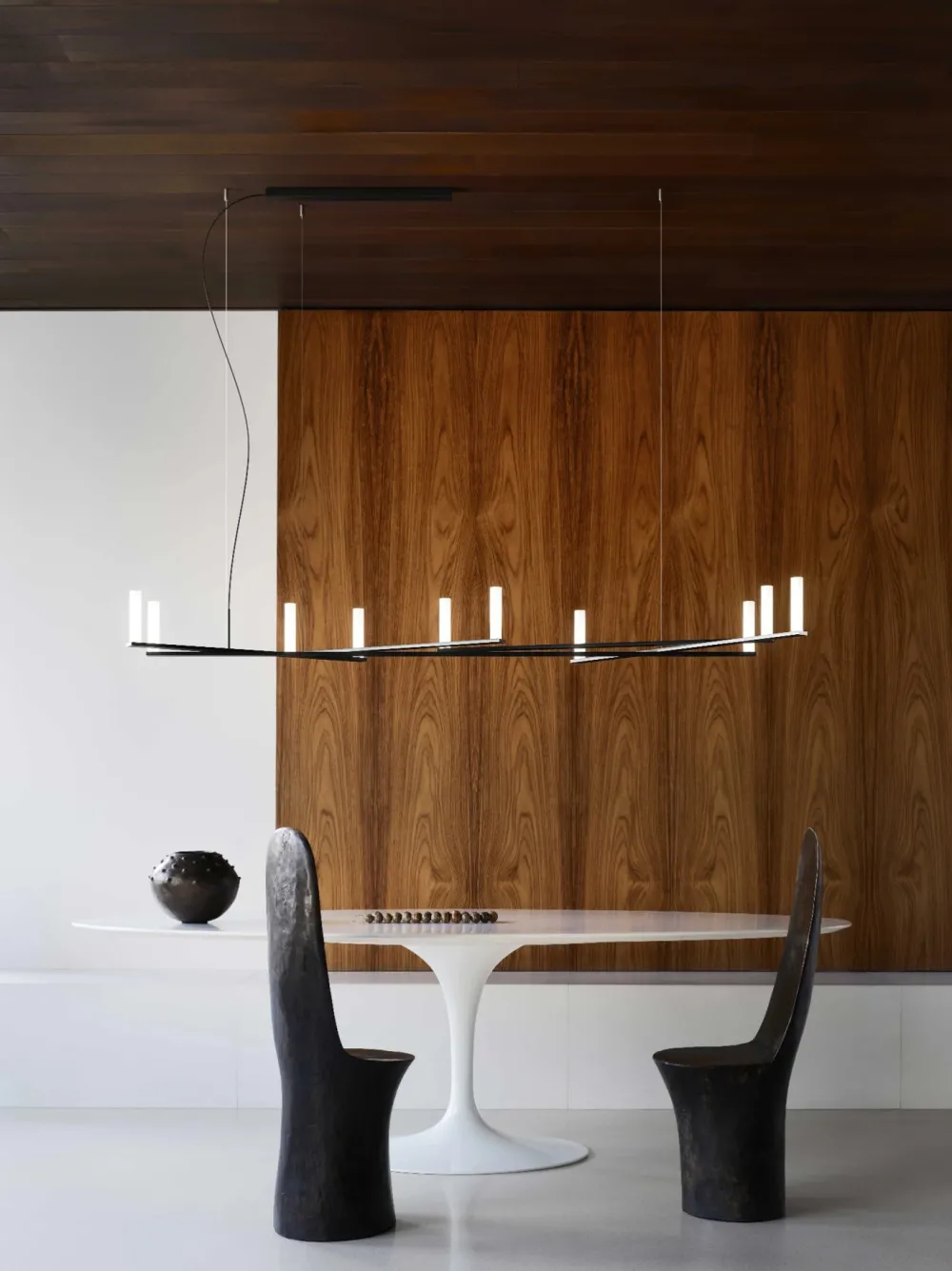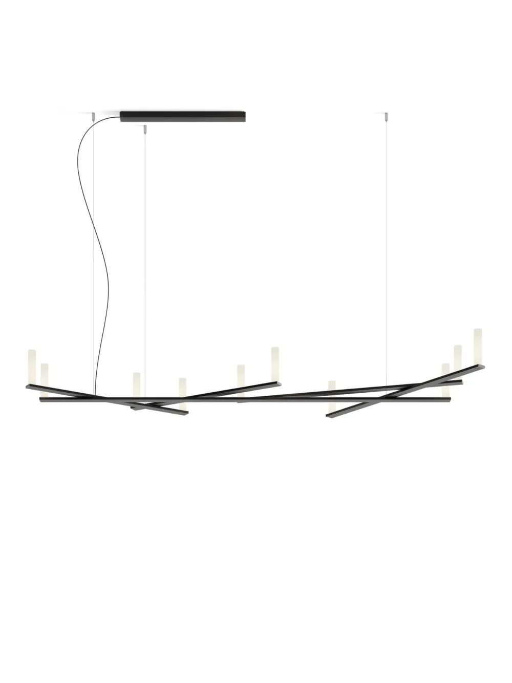 Majestueuse et sculpturale, la suspension Dix Bougies grand modèle déploie ses bras en aluminium dans une composition graphique audacieuse et asymétrique. Sa structure linéaire principale, traversée par quatre éléments décalés, guide le courant jusqu’aux extrémités, où les sources LED diffusent une lumière douce à travers des cylindres de papier technologique, mêlant cellulose et fibres synthétiques. Cette pièce d’envergure transforme n’importe quelle pièce en scène architecturale lumineuse, parfaite pour habiller un salon, une grande entrée ou une table de réception.