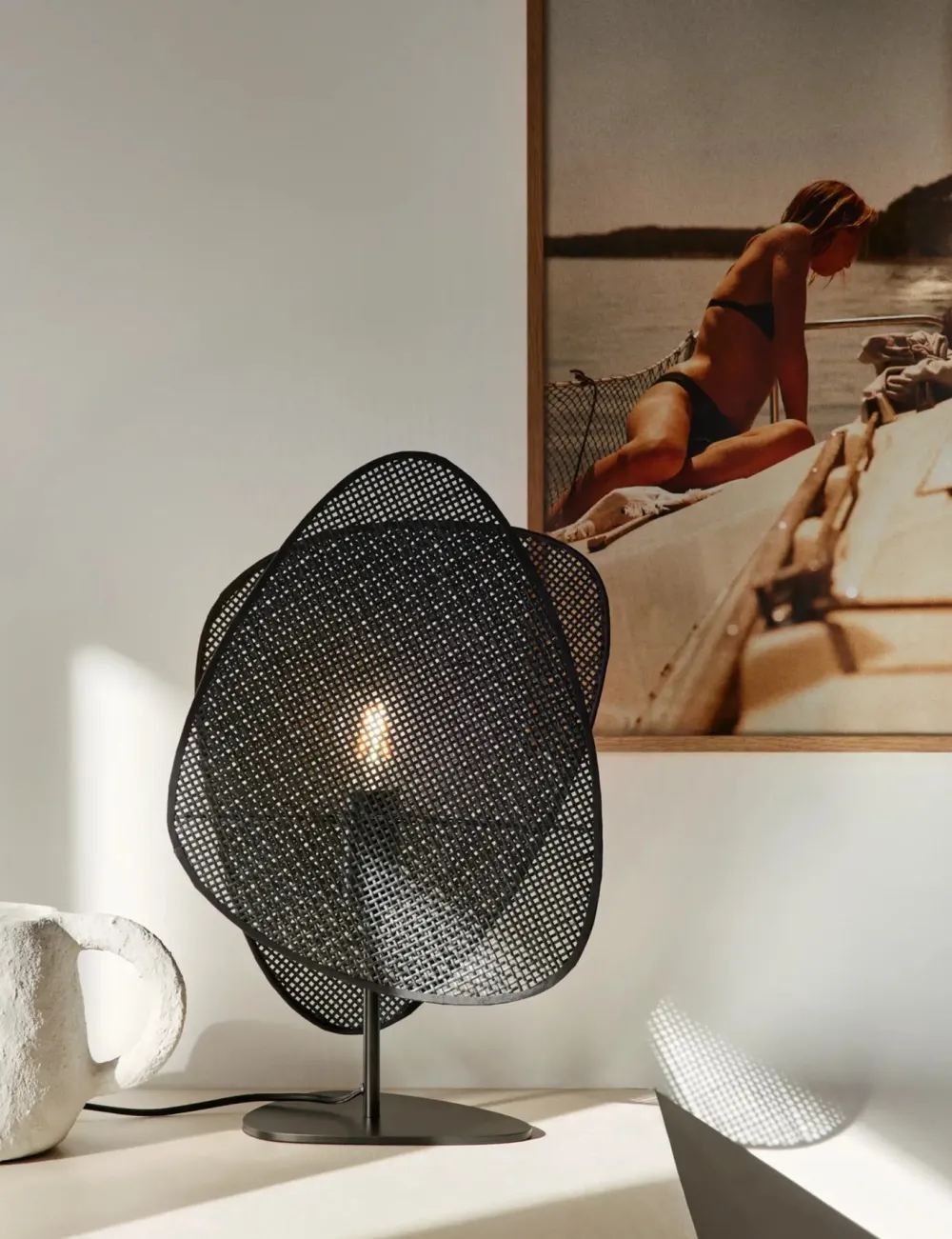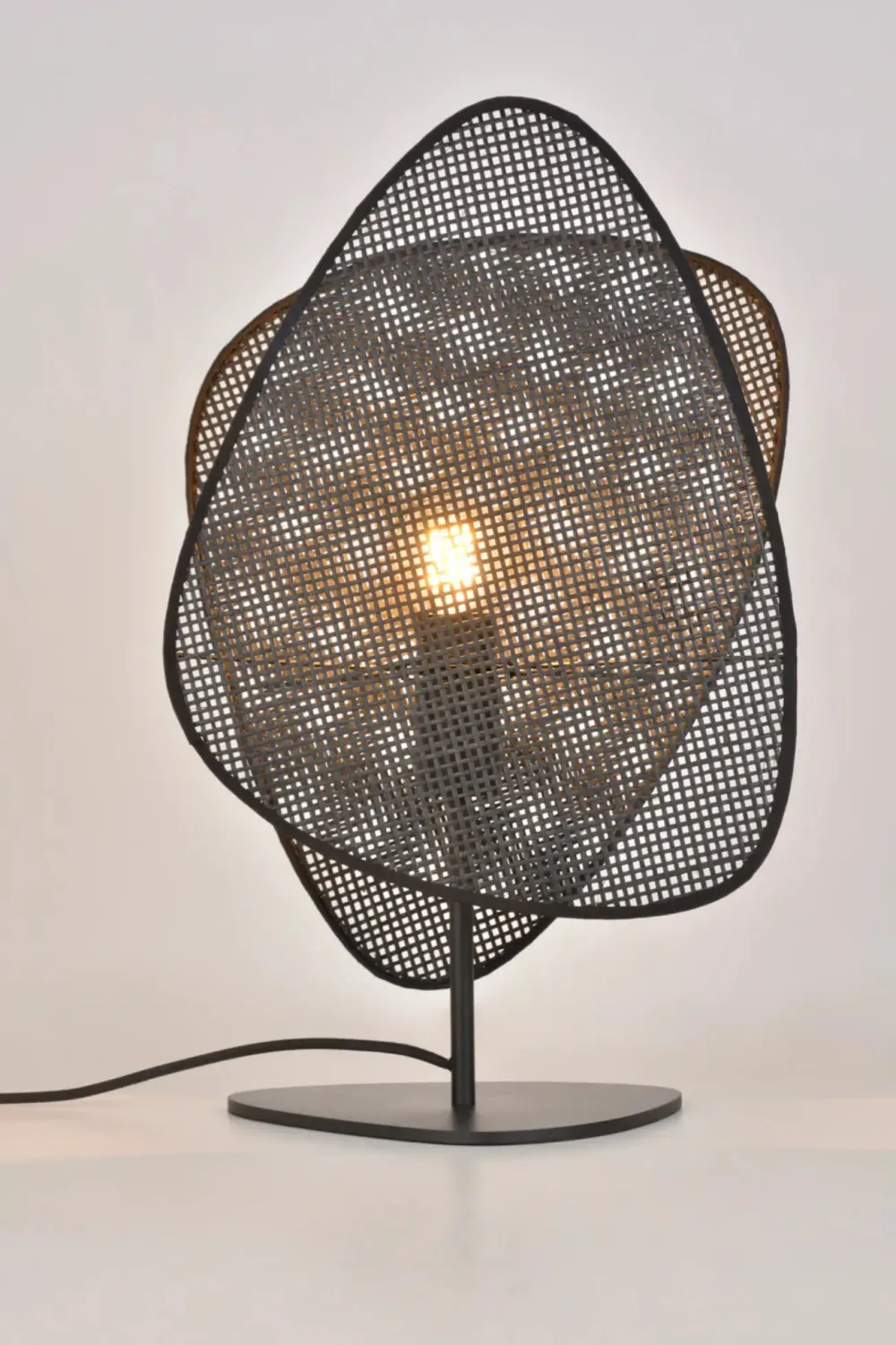 Lampe SCREEN avec base en métal peint et abat-jour 2 écrans. Design aérien et lumière tamisée pour une ambiance élégante et intemporelle.