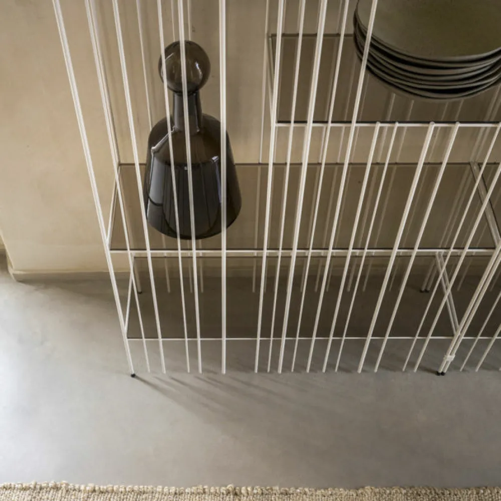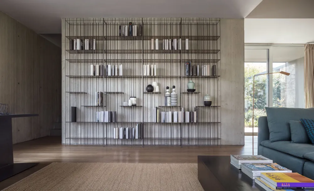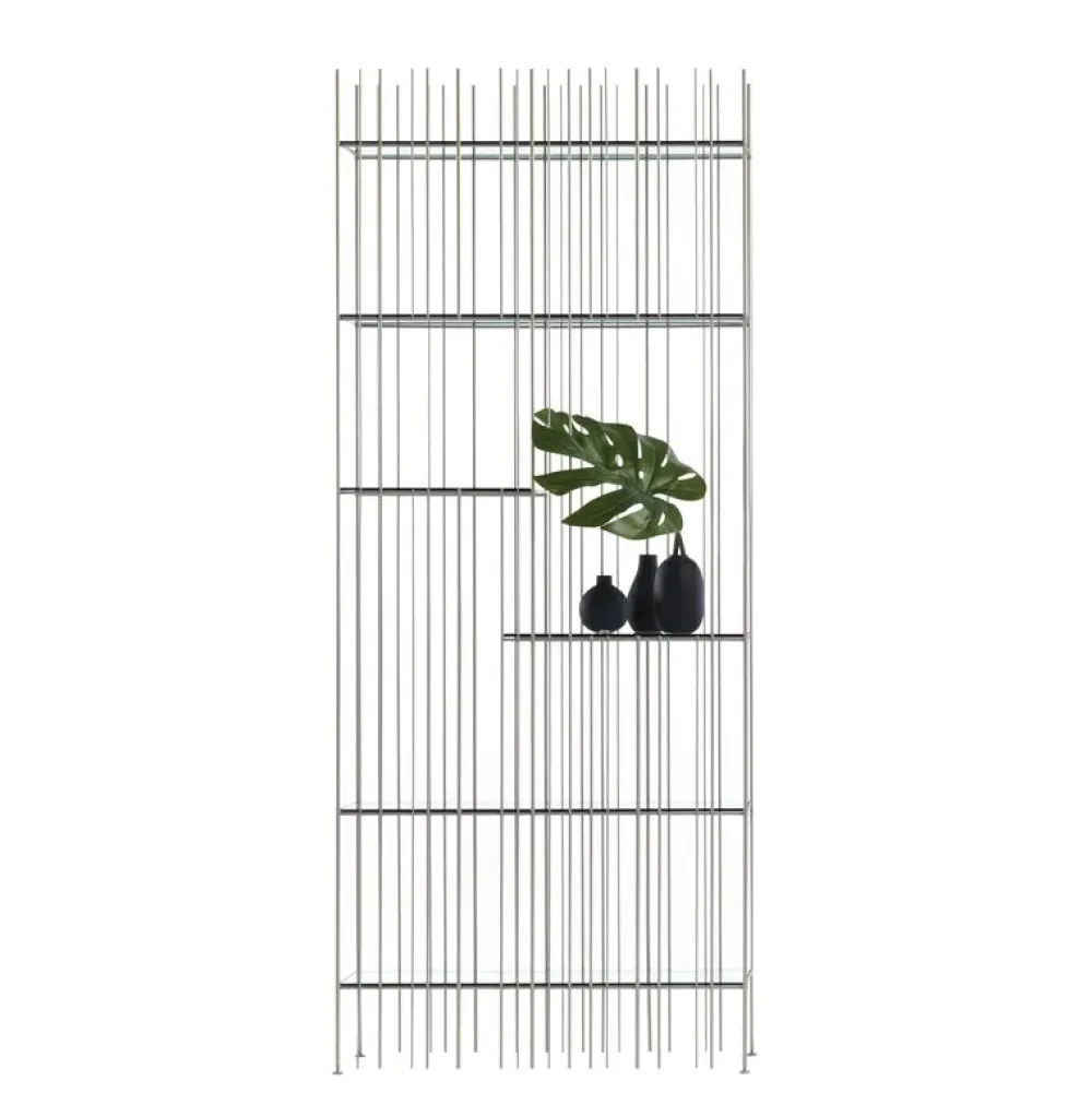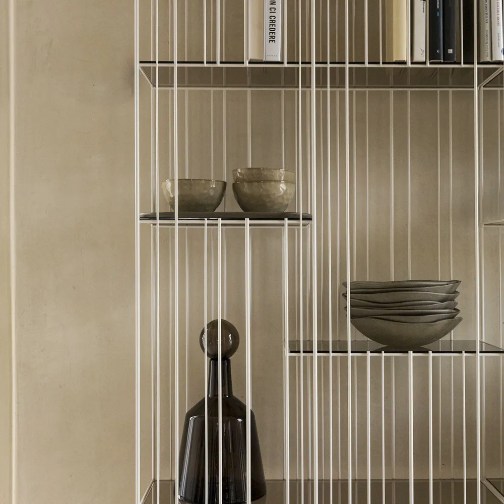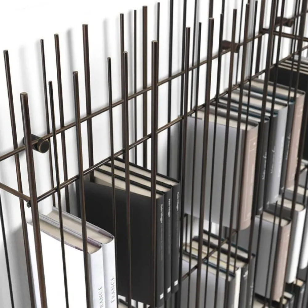 La structure est simple, le rythme est marqué par les tiges de fer fixées à différents intervalles sur une structure ouvertement rigoureuse à l’intérieur de laquelle les livres et objets insérés complètent la forme en écrivant de temps en temps de nouvelles compositions. Metrica est une bibliothèque en métal disponible dans les finitions titane, bruni et or avec des étagères en cristal transparent disponibles en bronze ou vert. Etagères fournies en Bronze, en vert sur demande.