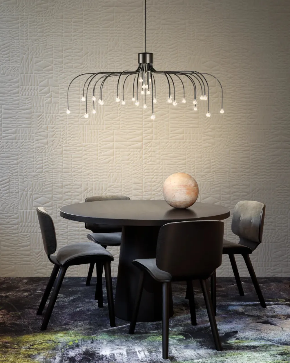 Ponctué de 30 sources lumineuses LED, ce lustre à l’envers apporte une chute d’étoiles perpétuelle dans votre intérieur. Grâce à 30 bras minces de différentes longueurs, il ressemble non seulement à des étoiles filantes, mais aussi à un ciel nocturne étoilé avec des points de lumière à différentes hauteurs. Une toute nouvelle constellation à découvrir ! L’installation est un jeu d’enfant, grâce aux bras déjà en place, vous pouvez donc profiter de vos étoiles filantes en quelques instants.