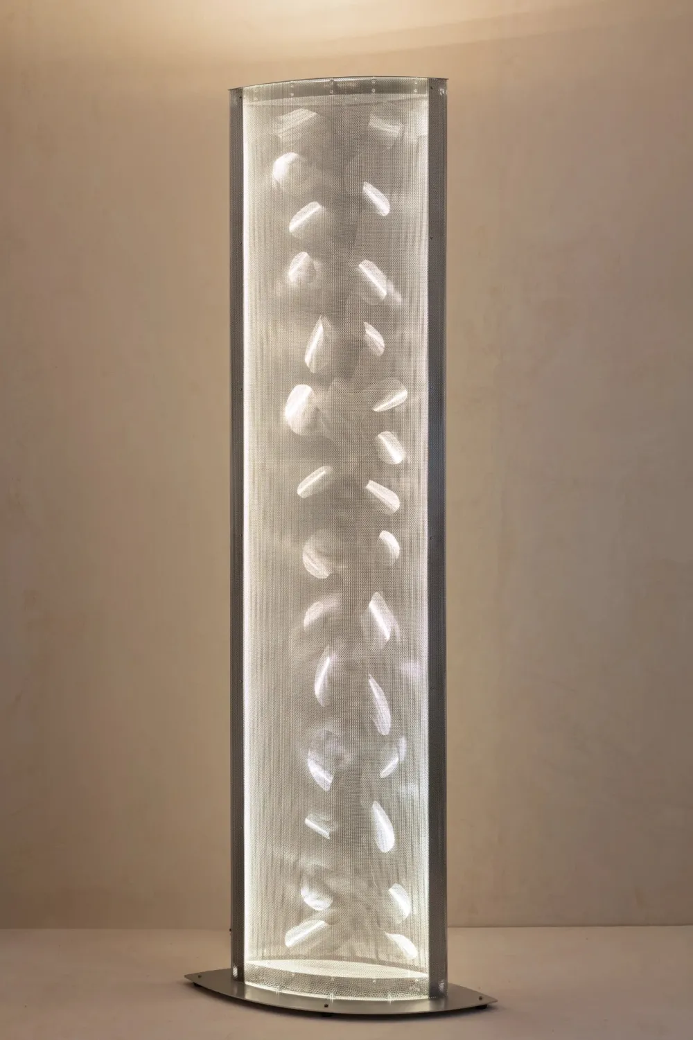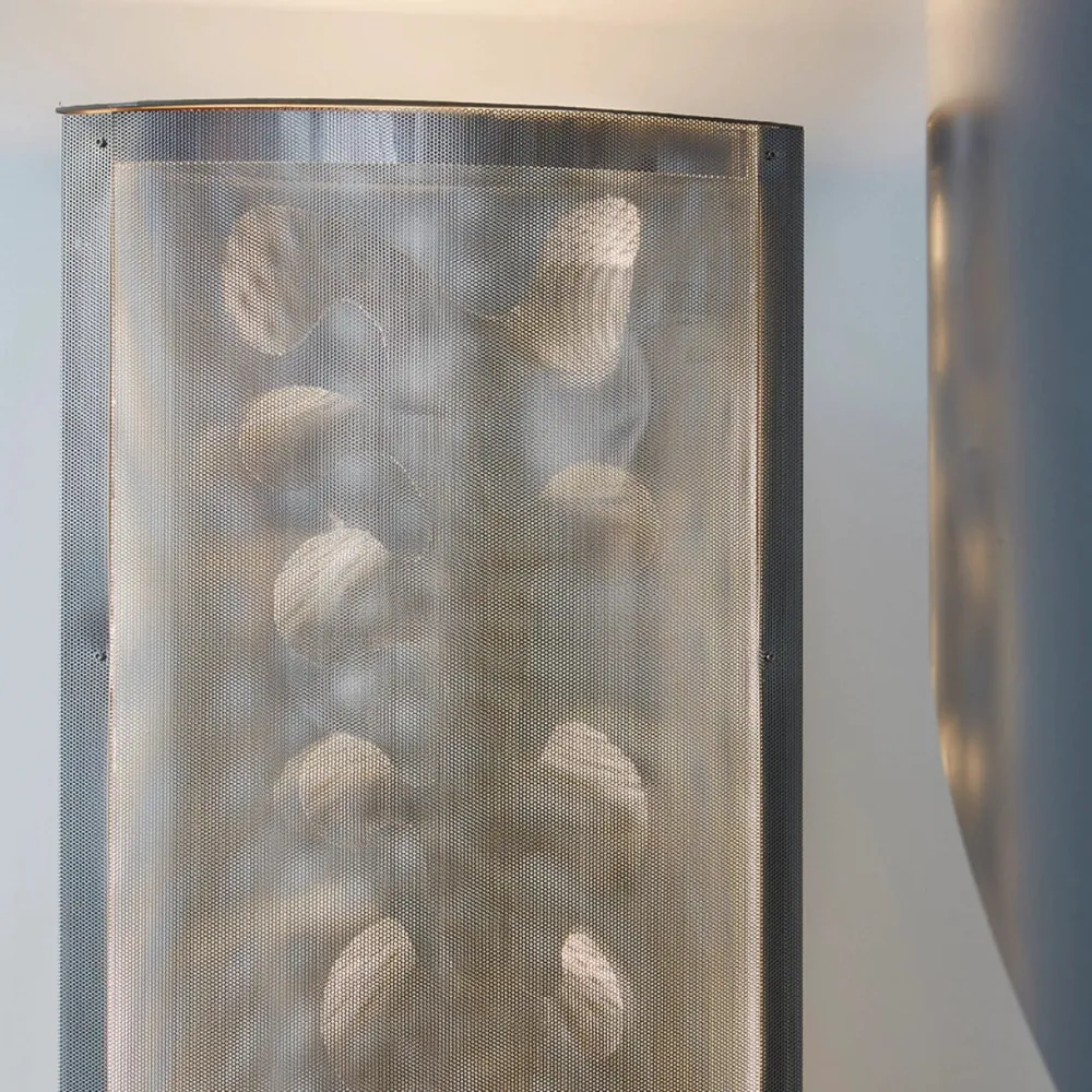 Véritable sculpture lumineuse en inox perforé poli miroir, la Colonne Ailes est réalisée de façon artisanale dans l’atelier parisien du designer.