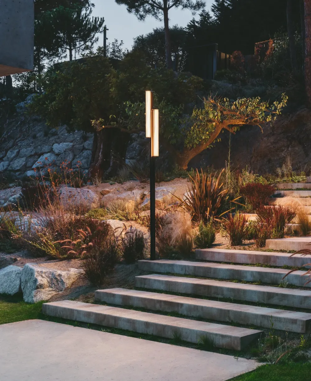 Intemporelle et élégante, la collection Class allie l’esthétique raffinée et intime d’une lampe outdoor aux performances fonctionnelles d’une lampe de sol ou d’une applique. Au lieu de s’intégrer silencieusement à l’environnement du jardin, elle se dresse fièrement en diffusant d’une lumière douce. Conçu pour se balancer au gré de la brise, chaque tube de verre est soutenu par une tige robuste en aluminium, disponible en deux hauteurs, le verre cannelé permet à la lumière de passer doucement à travers tout en masquant la source. Le noir mat de la tige contraste avec la surface lisse des tubes de verre.